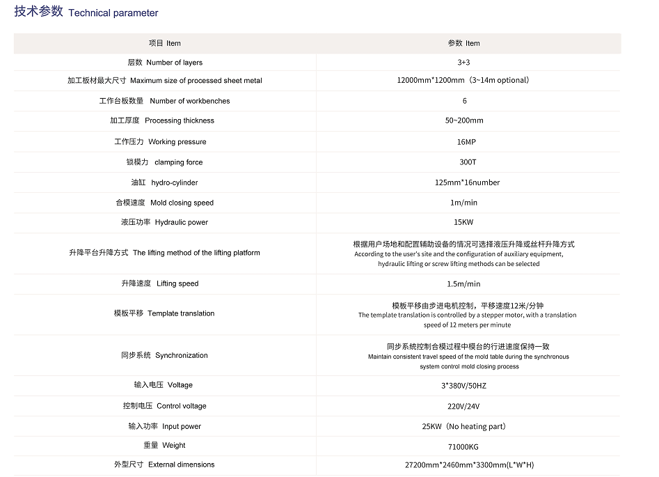 二是自動升降平臺,她的作用是從打開的層壓機工作區(qū)中將完成工作的模板取出,然后下降到適合工作的高度,再有人工或機械手將保溫板取出,然后進行鋪裝工作,再將準(zhǔn)備好的模板送入層壓機,然后在取出下一塊模板,直至將三塊模板都完成工作。